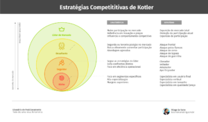 Uma introdução às estratégias competitivas de Philip Kotler, que abordam os quatro principais posicionamentos de mercado: líder, desafiadora, seguidora e especialista.